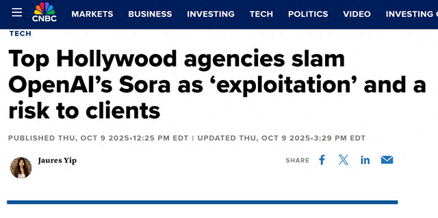 除经纪公司外,影视行业巨头及权威机构也纷纷采取行动。据《洛杉矶时报》报道,威廉・莫里斯奋进经纪公司已在内部备忘录中明确,已正式通知OpenAI,要求“所有威廉・莫里斯奋进经纪公司的客户从最新的SoraAI更新中退出”,且这一要求不依赖于客户关联版权方是否曾提出退出申请,以全面维护旗下艺人权益。