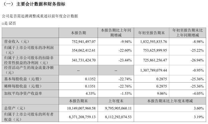 其中第三季度,公司营业收入为7.53亿元,同比下降9.9%;归母净利润为3.54亿元,同比下降22.6%;扣非归母净利润为3.42亿元,同比下降23.4%;EPS为0.1349元。